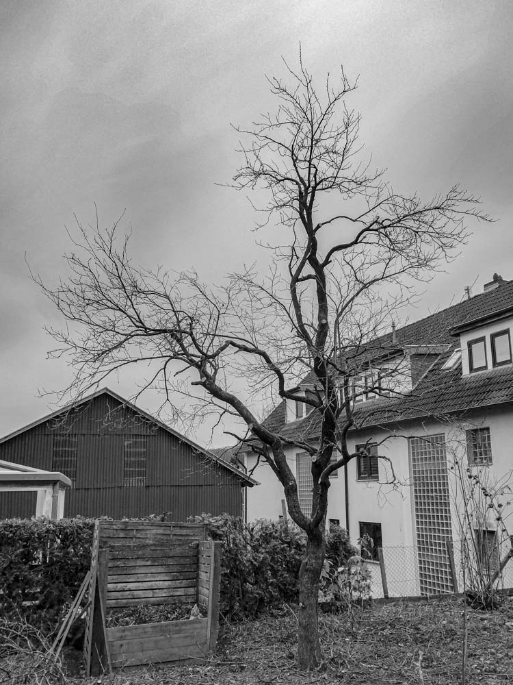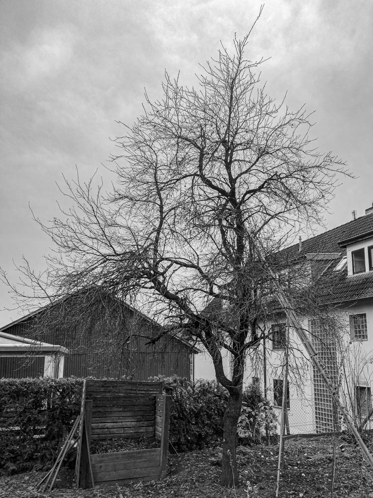 Ein älterer Zwetschgenbaum der durch fehlende Pflege seine Krone weit nach oben verlagert hat. Unser Schnitt hat das viele Fruchtholz verjüngt, das Höhenwachstum begrenzt und dafür gesorgt, dass wieder alle Bereiche gut mit Licht und Luft versorgt werden. Wichtig: Der „Charakter“ des Baumes bleibt erhalten und wird nicht verstümmelt.